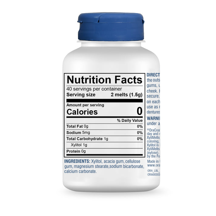 What are XyliMelts? XyliMelts are oral-adhering discs that stick to your teeth or gums to relieve persistent dry mouth. Use XyliMelts during the day or while sleeping and find temporary relief from frequent thirst, sticky dryness in the mouth and throat, and other unpleasant dry mouth symptoms. Made with xylitol, a natural sweetener that helps stimulate saliva flow, XyliMelts utilize adhering disc technology to slowly release 550 mg of xylitol, which is most effective when continuously released and lingers in the mouth, especially when used while sleeping when saliva flow is lowest. XyliMelts last for hours, moisturizing and coating the mouth for optimal comfort. The mild mint flavor freshens your breath and the xylitol may reduce the risk of tooth decay.