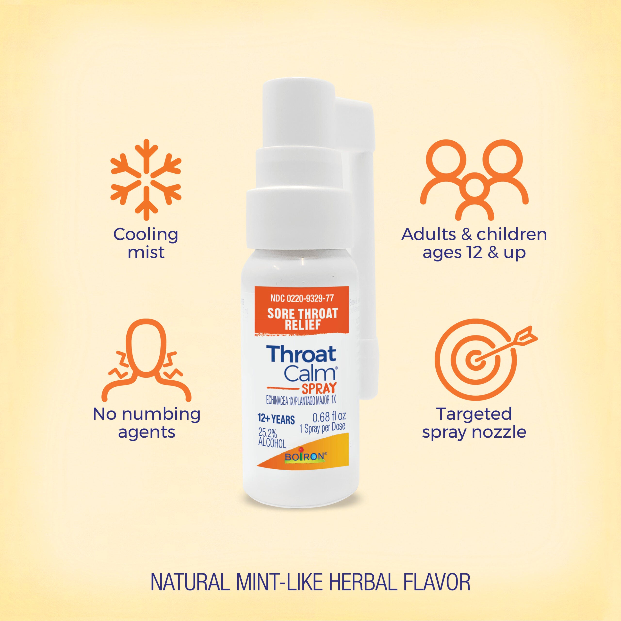 ThroatCalm Spray by Boiron is a cooling mist that works on contact to provide targeted sore throat relief without the numbing effects of traditional throat sprays and lozenges. Every spray delivers a dose of plant-powered active ingredients, including Echinacea, to soothe and relieve occasional minor sore throat pain.* The natural, mint-like herbal flavor tastes light and refreshing, making it a go-to solution for easy and enjoyable relief.